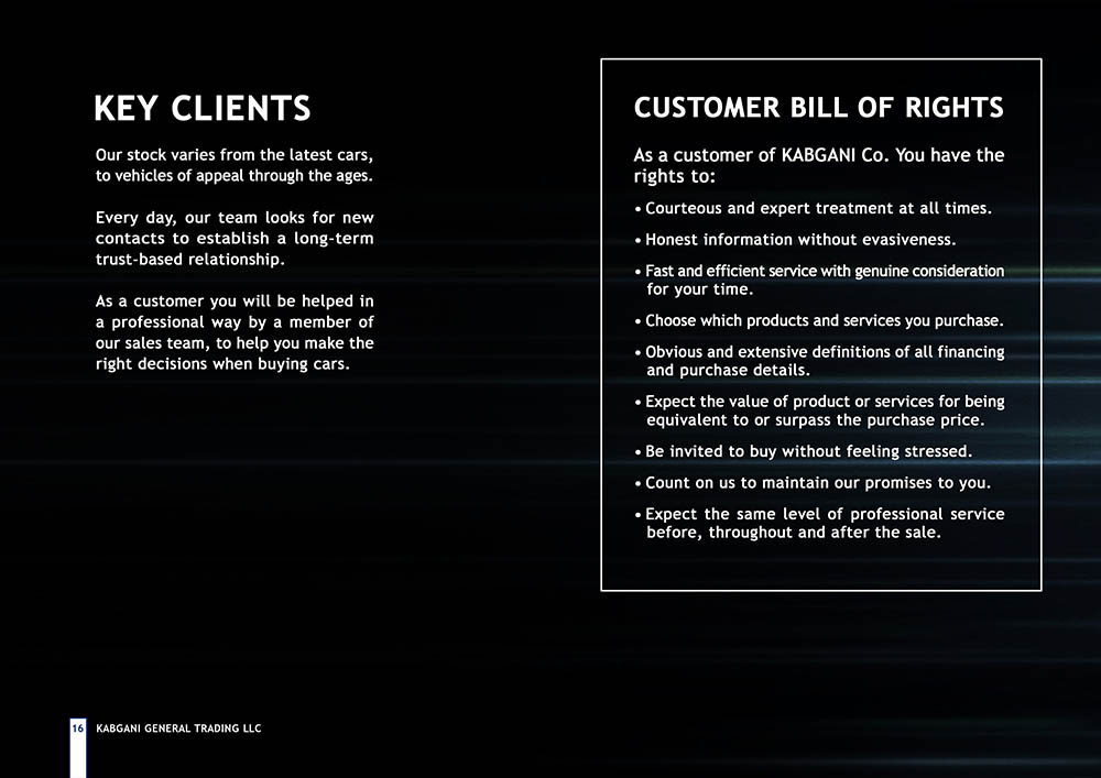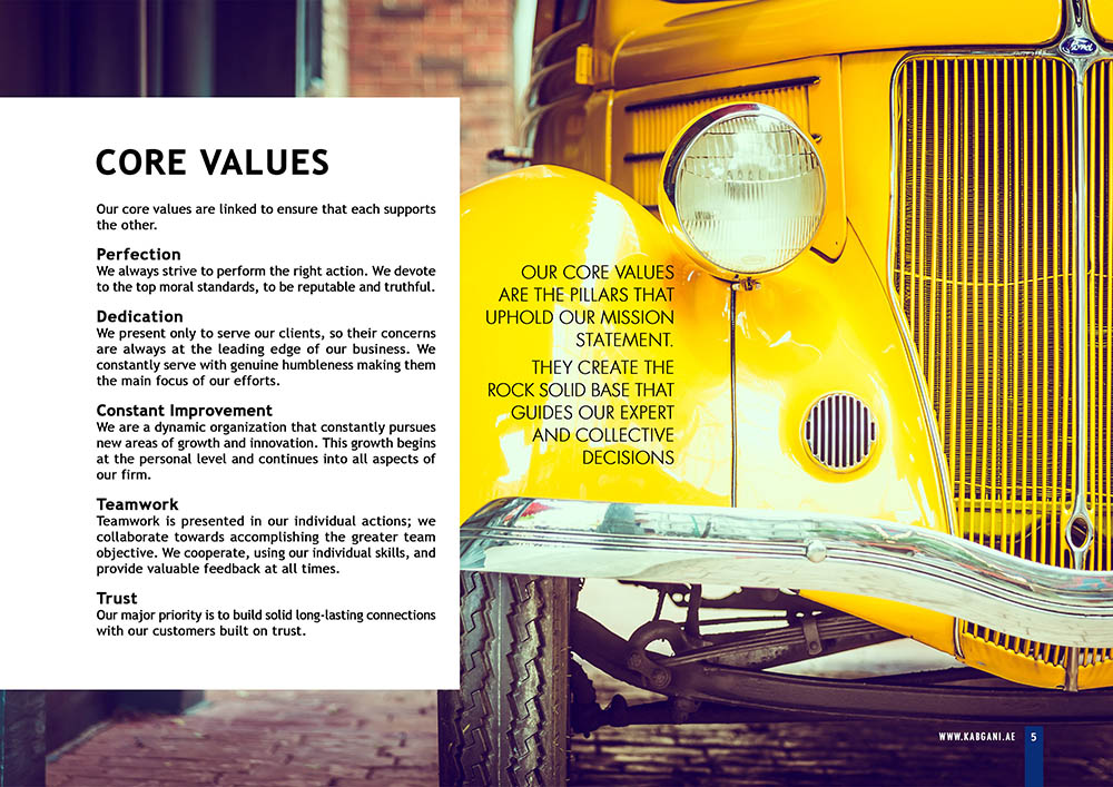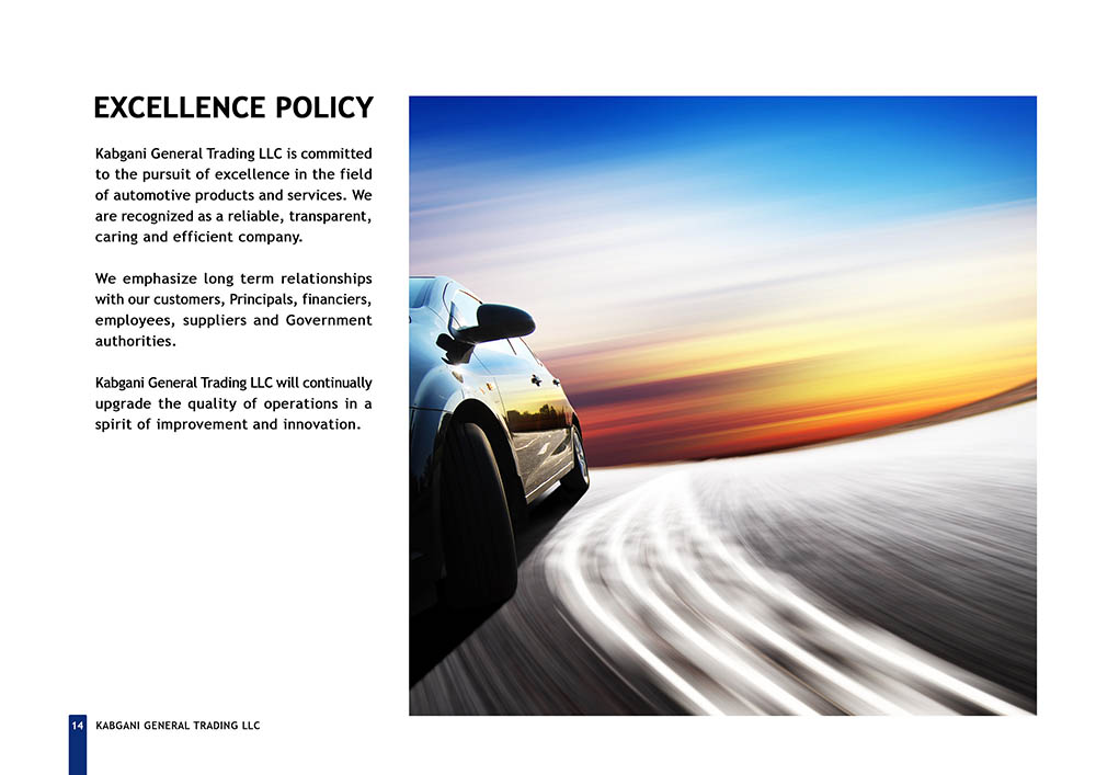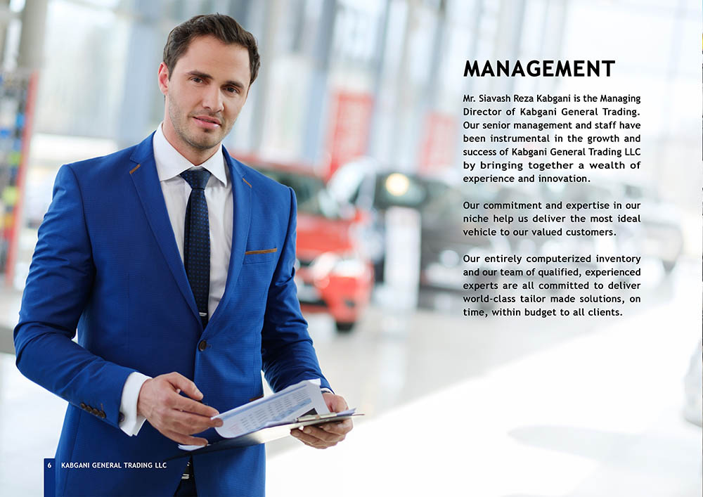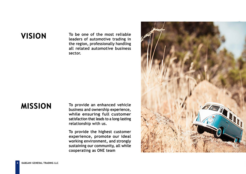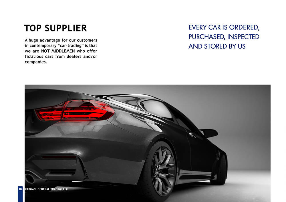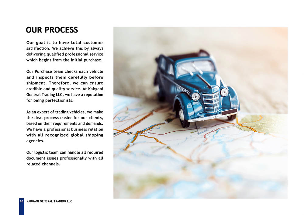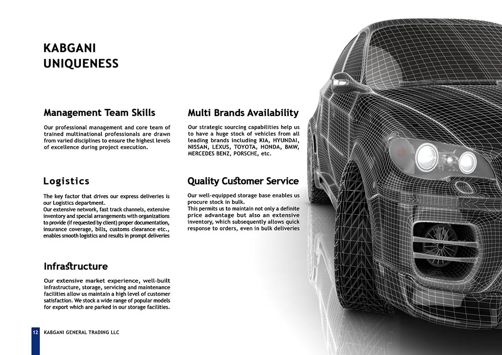 Kabgani, established in December 2007 in Dubai, United Arab Emirates, stands as one of the leading trading companies across the European Union (EU), Middle East and North Africa (MENA), and Gulf Cooperation Council (GCC) regions. Specializing in the importation and distribution of vehicles worldwide, Kabgani has carved a niche for itself as a prominent player in the global trading landscape. However, despite its stellar reputation and expansive operations, Kabgani faced a significant challenge in the form of an outdated company profile. The management recognized the importance of aligning their corporate image with their professional stature and rapid development pace, prompting them to seek a solution to revamp their company profile.
