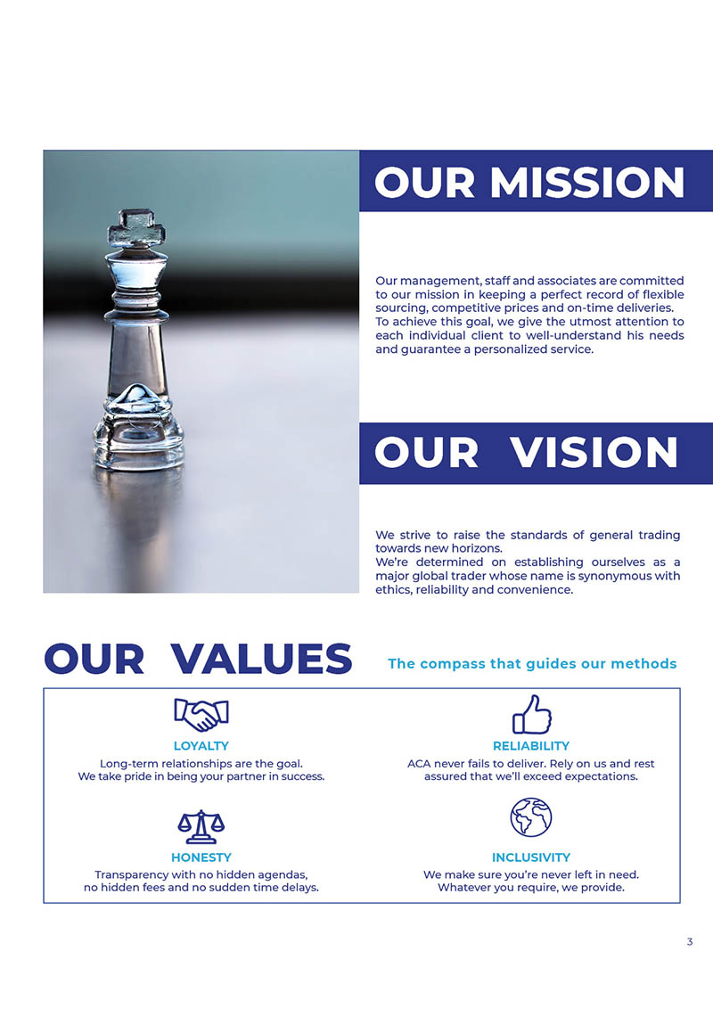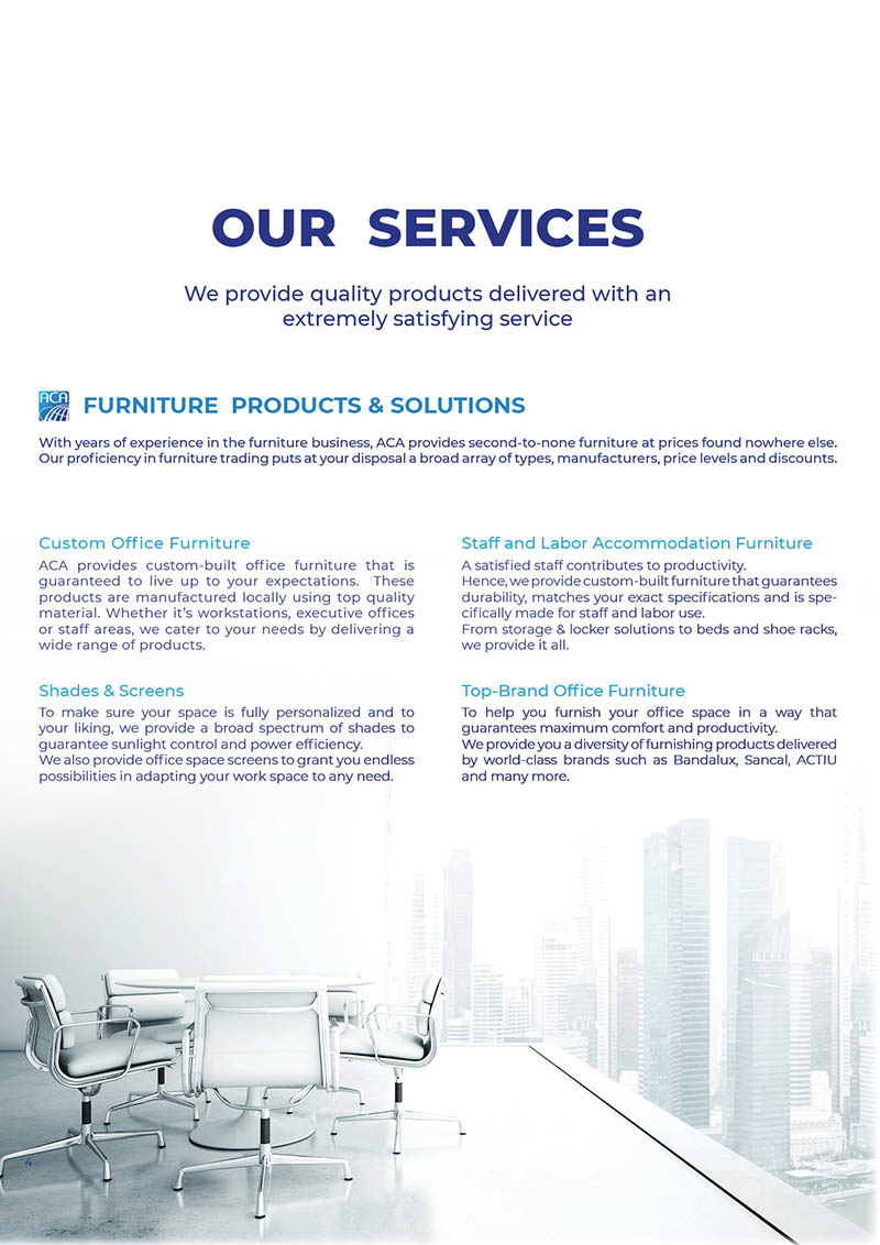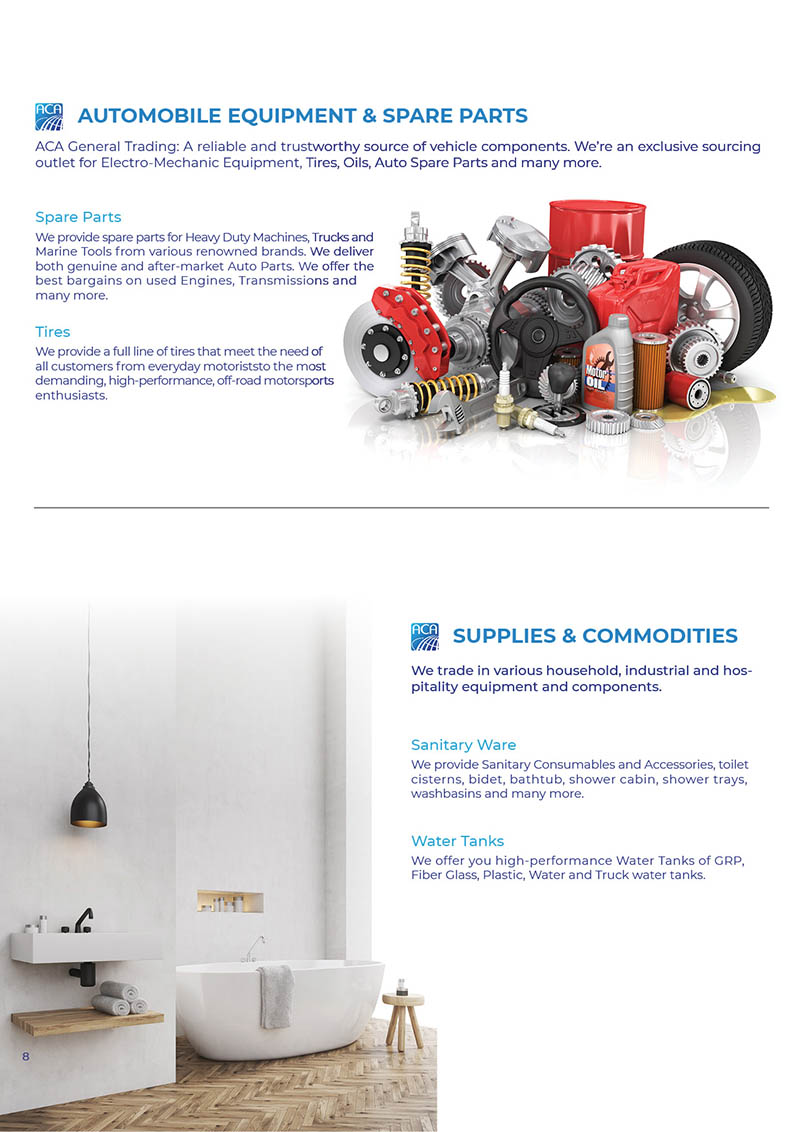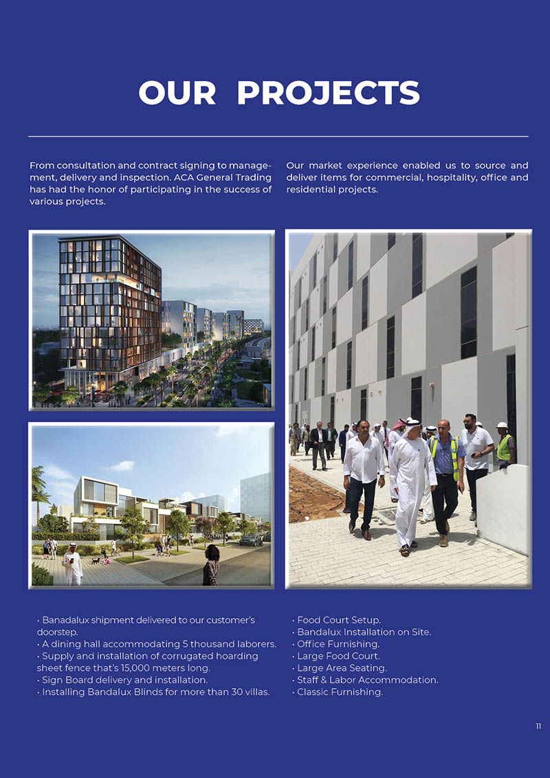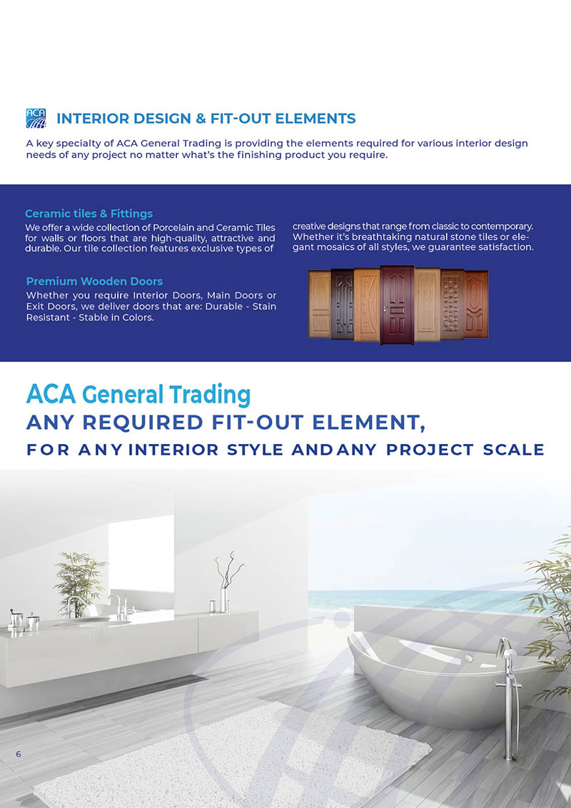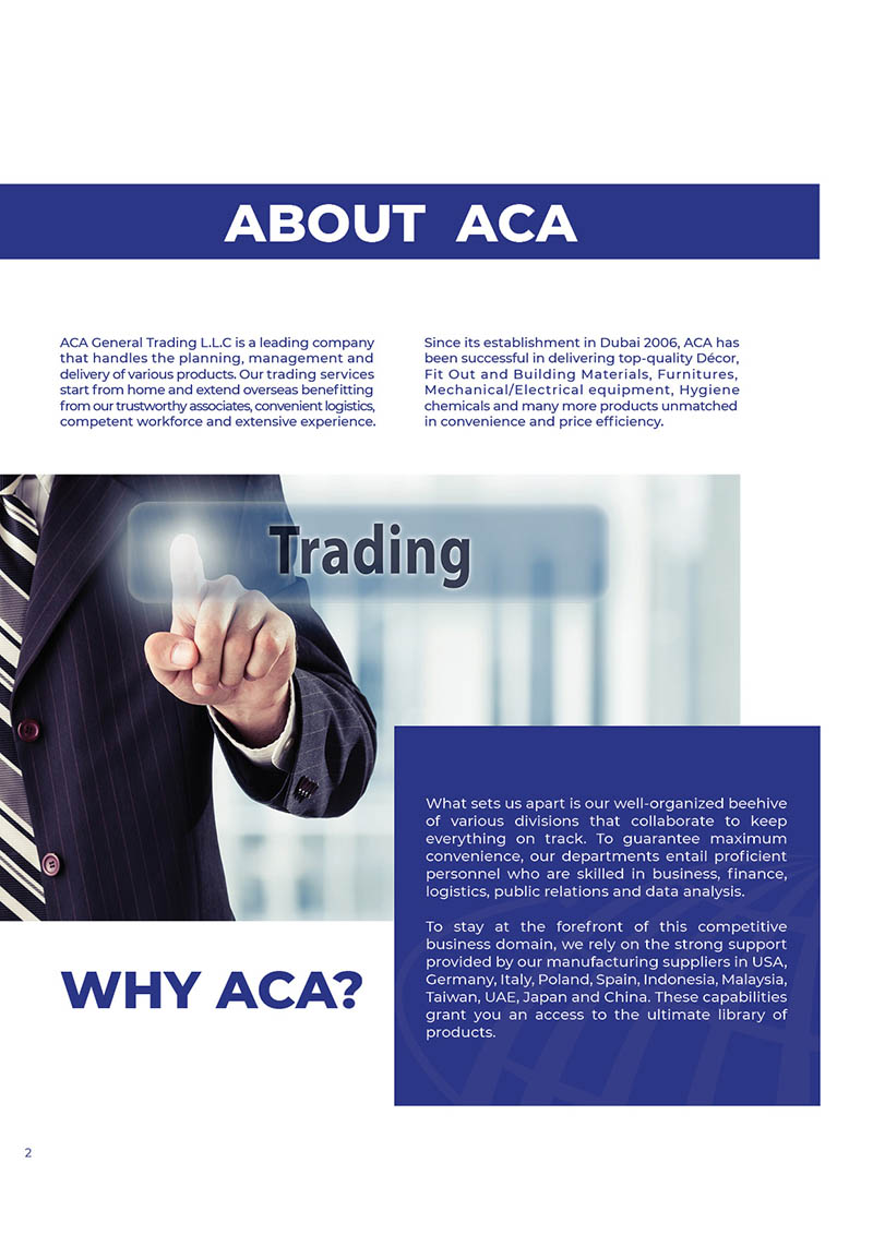 ACA General Trading L.L.C was established in 2006 in Dubai, UAE. Their trading business first began with delivering décor and fit out material, building material, hygiene products, furniture, and mechanical and electrical equipment. Now ACA is a leading trading company for those products and much more, including planning and management, partnerships with various businesses.