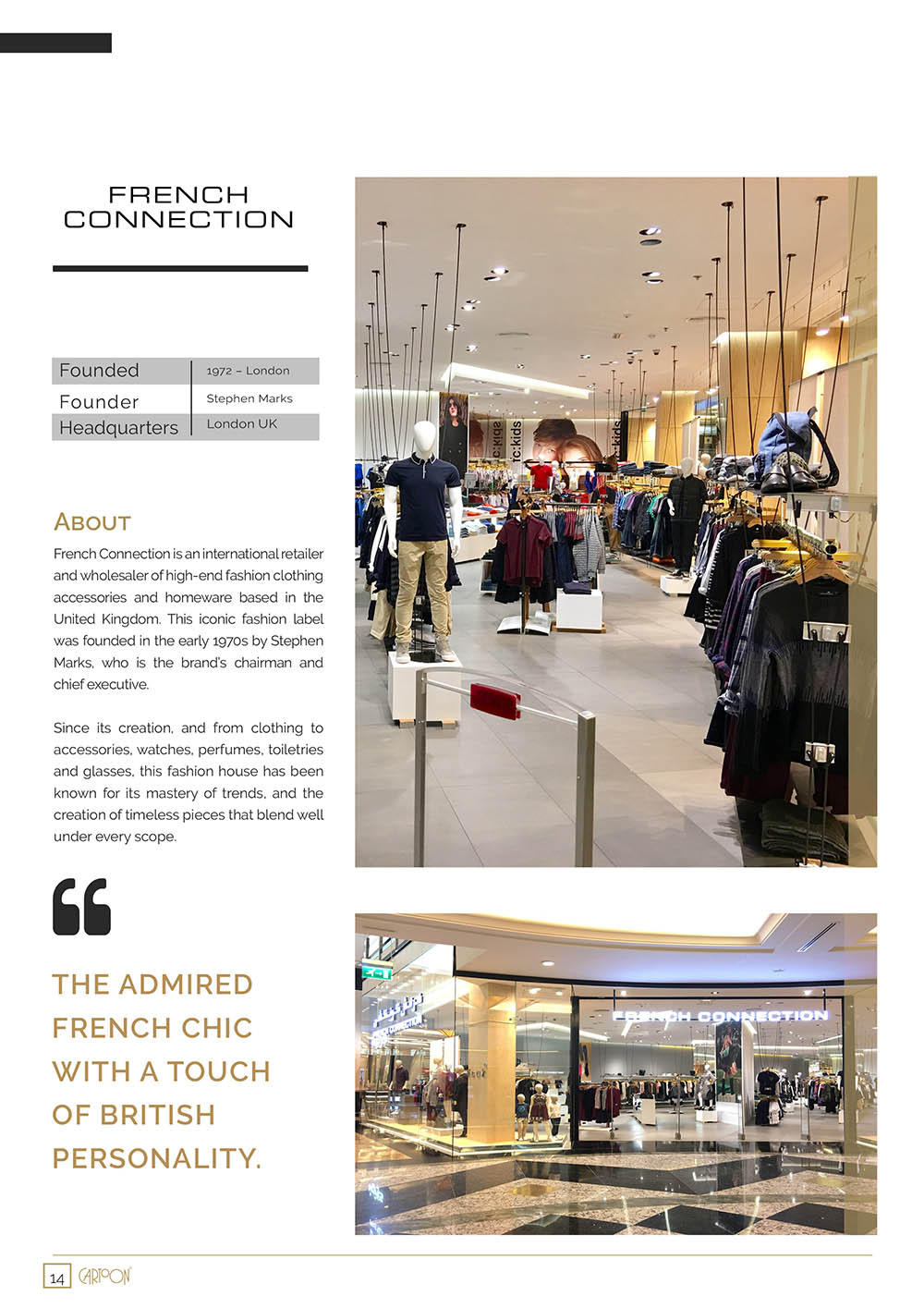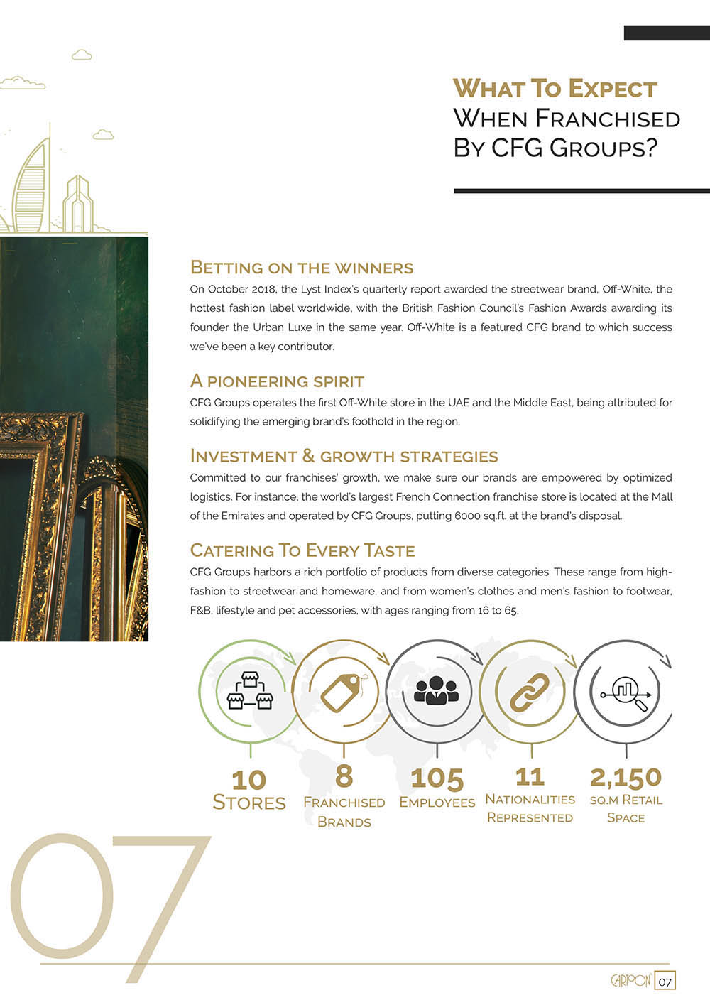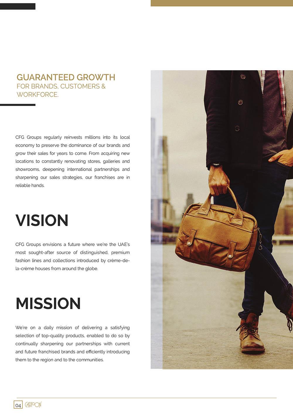 Dubai is one the largest shopping destinations worldwide, and fashion is certainly a major key player in that area. CFG Groups were looking to expand their business further and invite more brands to franchise with them. They had faced a challenge to prepare a portfolio that was professional and catchy in design at the same time, as well as being able to present and deliver the correct message they had in mind. The providers had faced issues to provide a complete profile with locations and information about the franchised brands while also keeping the profile non-monotonous. Stepping up to this challenge was the team at UCT to fulfill CFG’s request and provide exactly what they need and more.