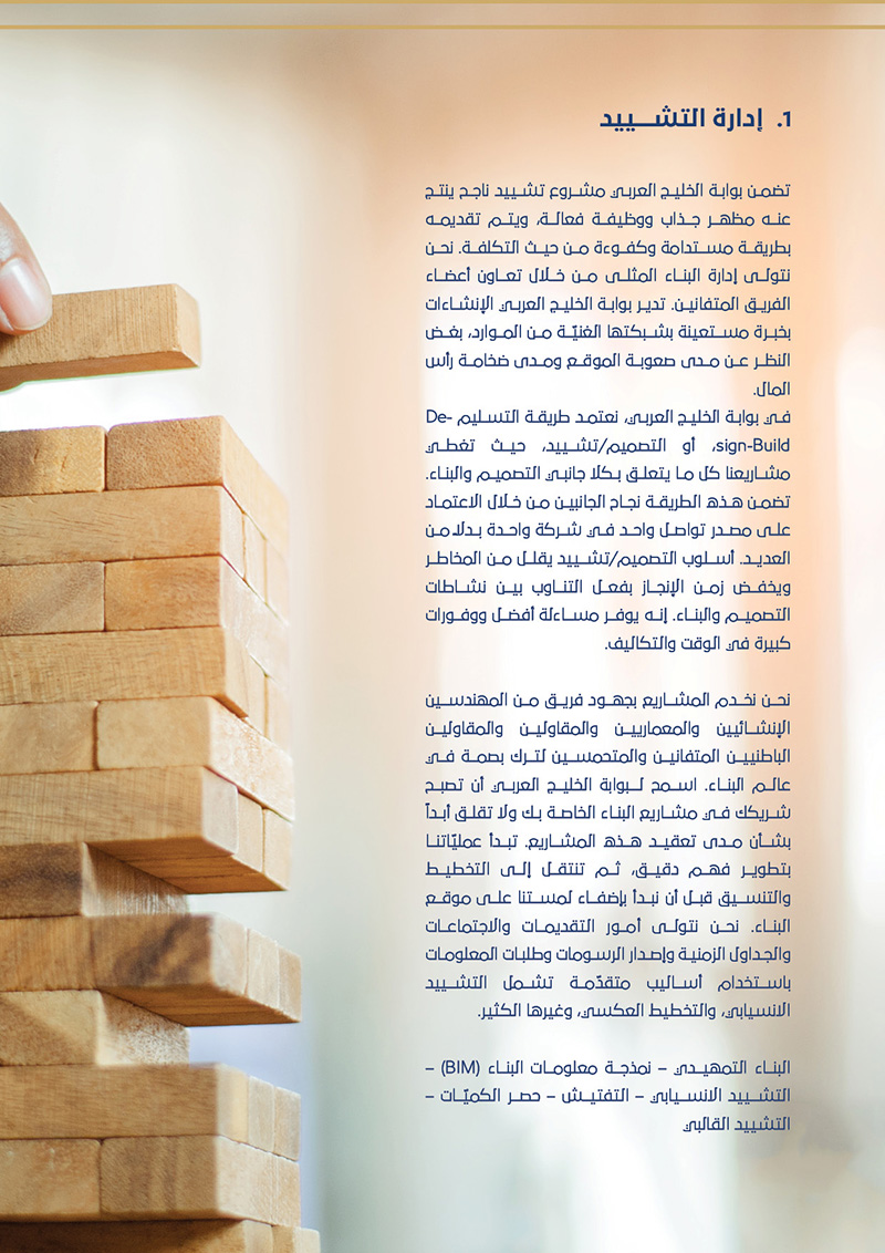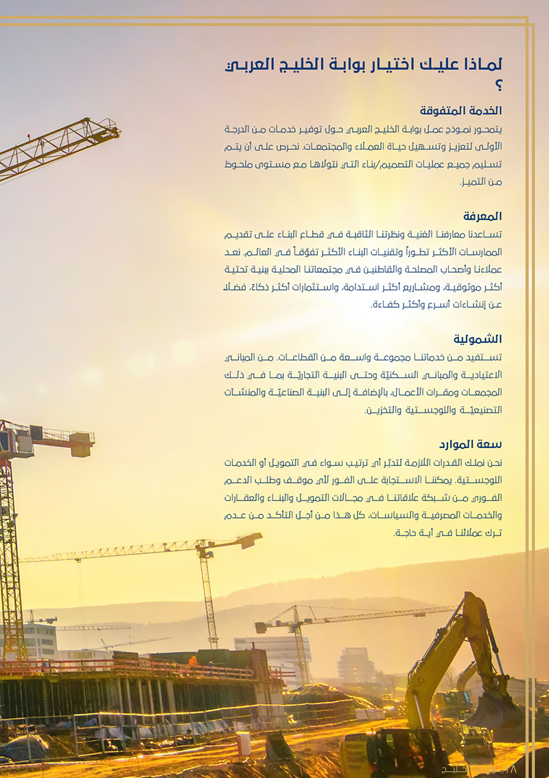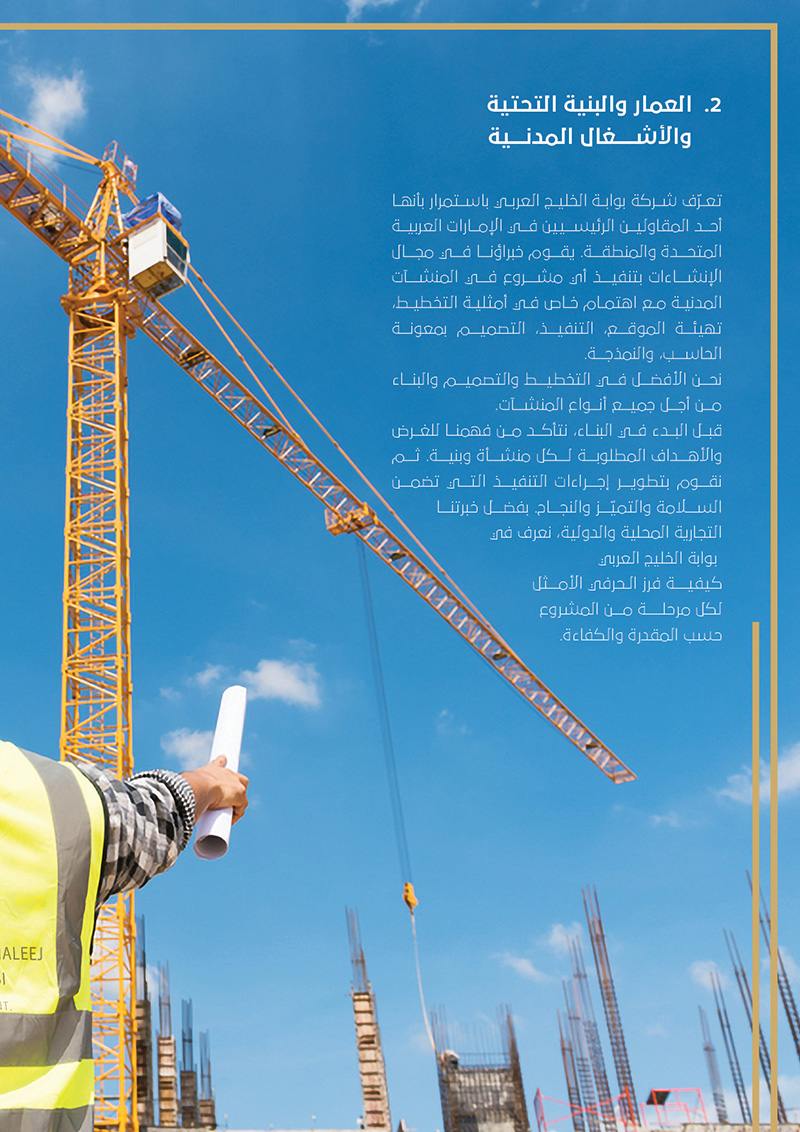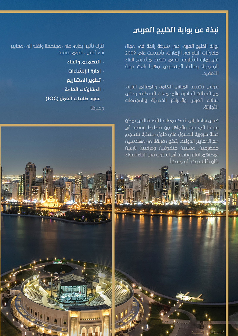 Gulf Contracting required the aid of a talented agency to develop a suitable profile, both in Arabic and English. Their main focus was for the profile to be educational and stand out as informative and engaging. It was imperative for Gulf Contracting to entrust this task to someone capable of maintaining a professional level of service while also working closely with the team at Gulf Marketing to ensure all the points they wanted to send across are properly detailed in the final profile. After consulting with several agencies and viewing their proposals and provided samples, Gulf Marketing entrusted this task to the team at UCT.
