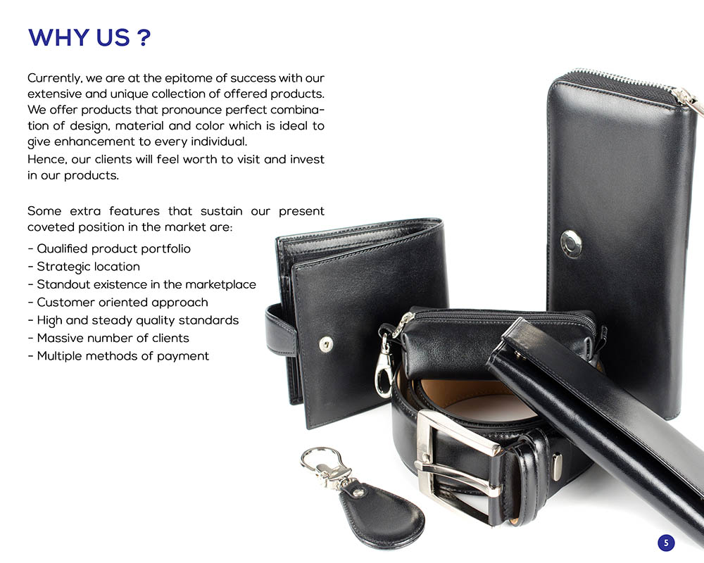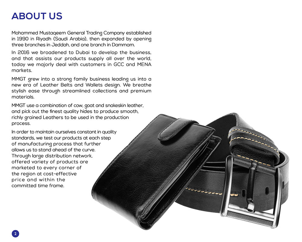 To further promote their high quality leather goods and ensure a solid place in an international market such as Dubai, MMGT had to rely on a strong and a capable partner that would develop their company profile in a creative and captivating manner. Most of the other agencies they turned to provided very basic company profiles that were either formatted on standard blank pages with little to no accompanying designs to go with the written content. Additionally, the competition was strong when it comes to leather goods in Dubai’s fashion booming market, so it was of more importance to obtain a unique and one of a kind company profile.