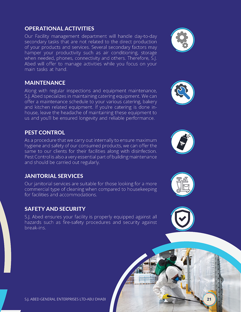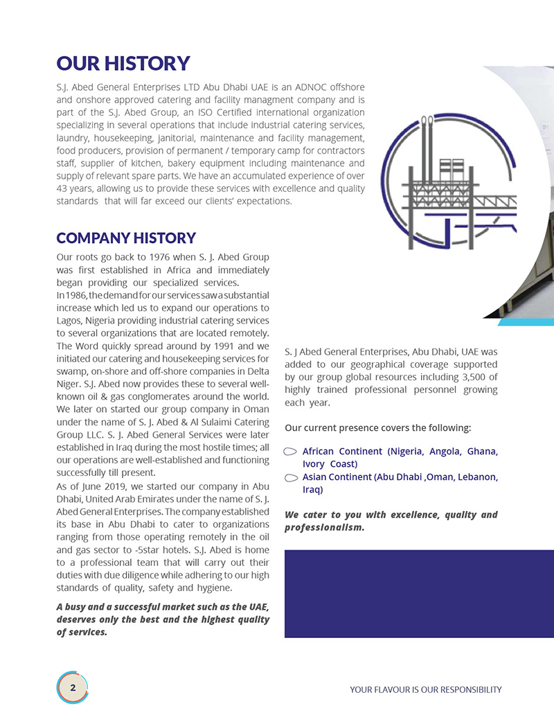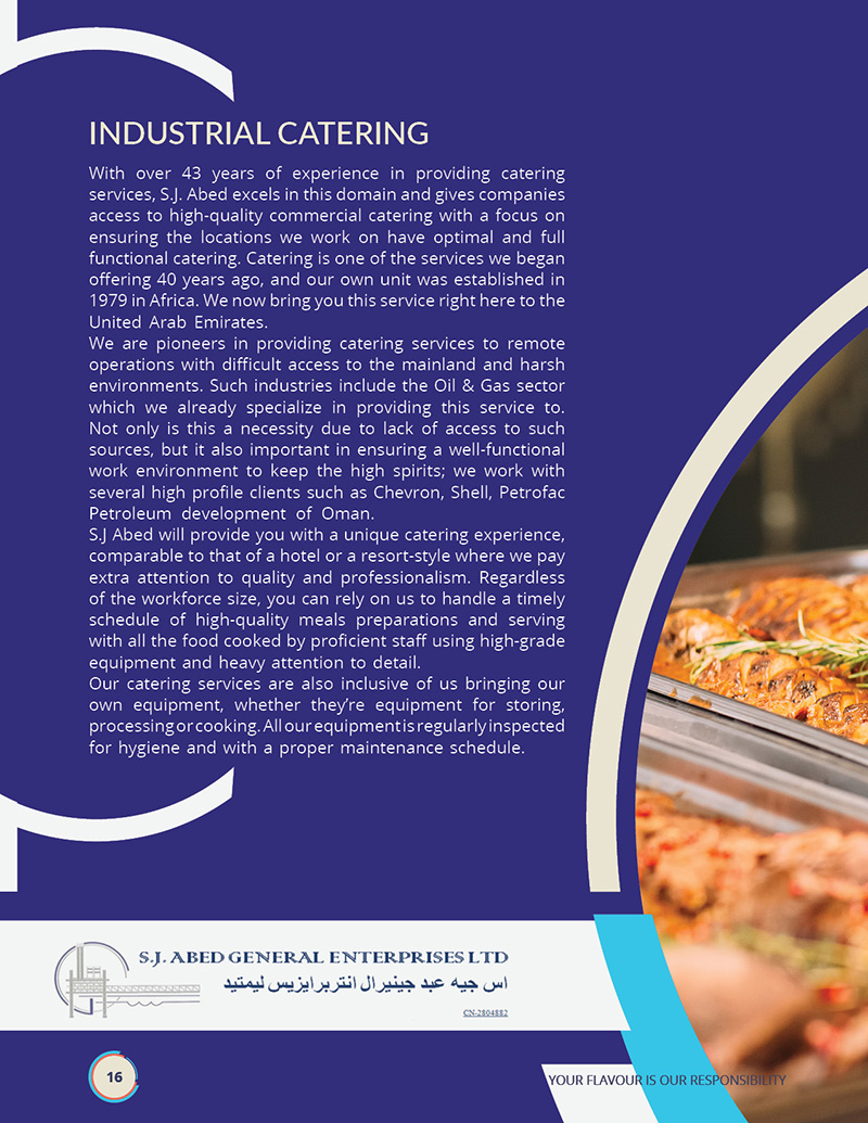 SJ Abed General Enterprises LTD is a renowned catering and facility management company based in Abu Dhabi, United Arab Emirates. With over 40 years of experience, they have established themselves as leaders in their industry, serving diverse sectors, including oil and gas and 5-star hotels. Their commitment to quality, safety, and hygiene has been their hallmark, making them a trusted choice for clients worldwide.