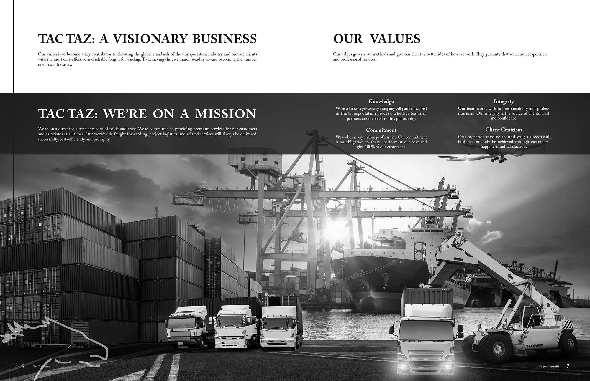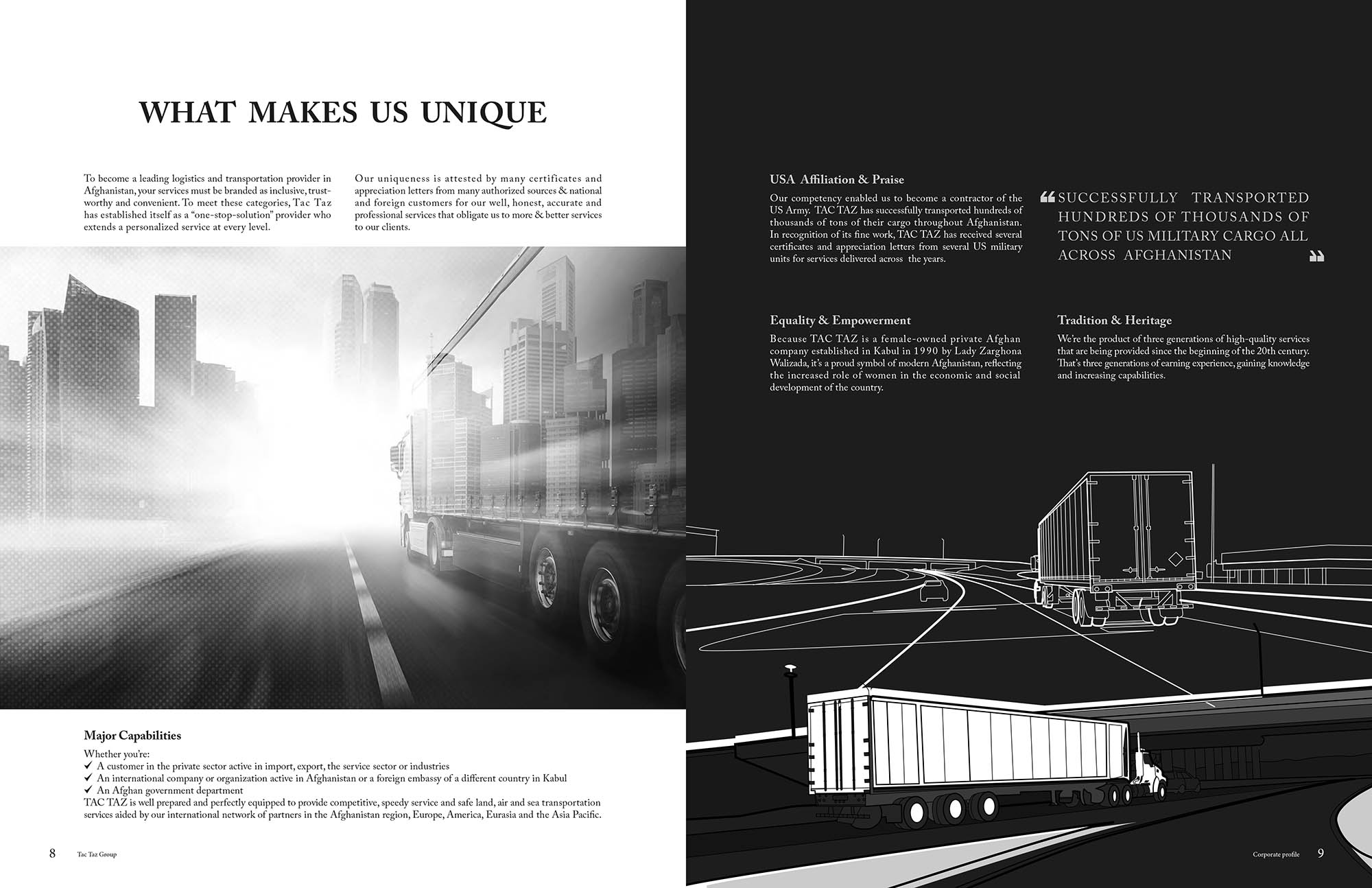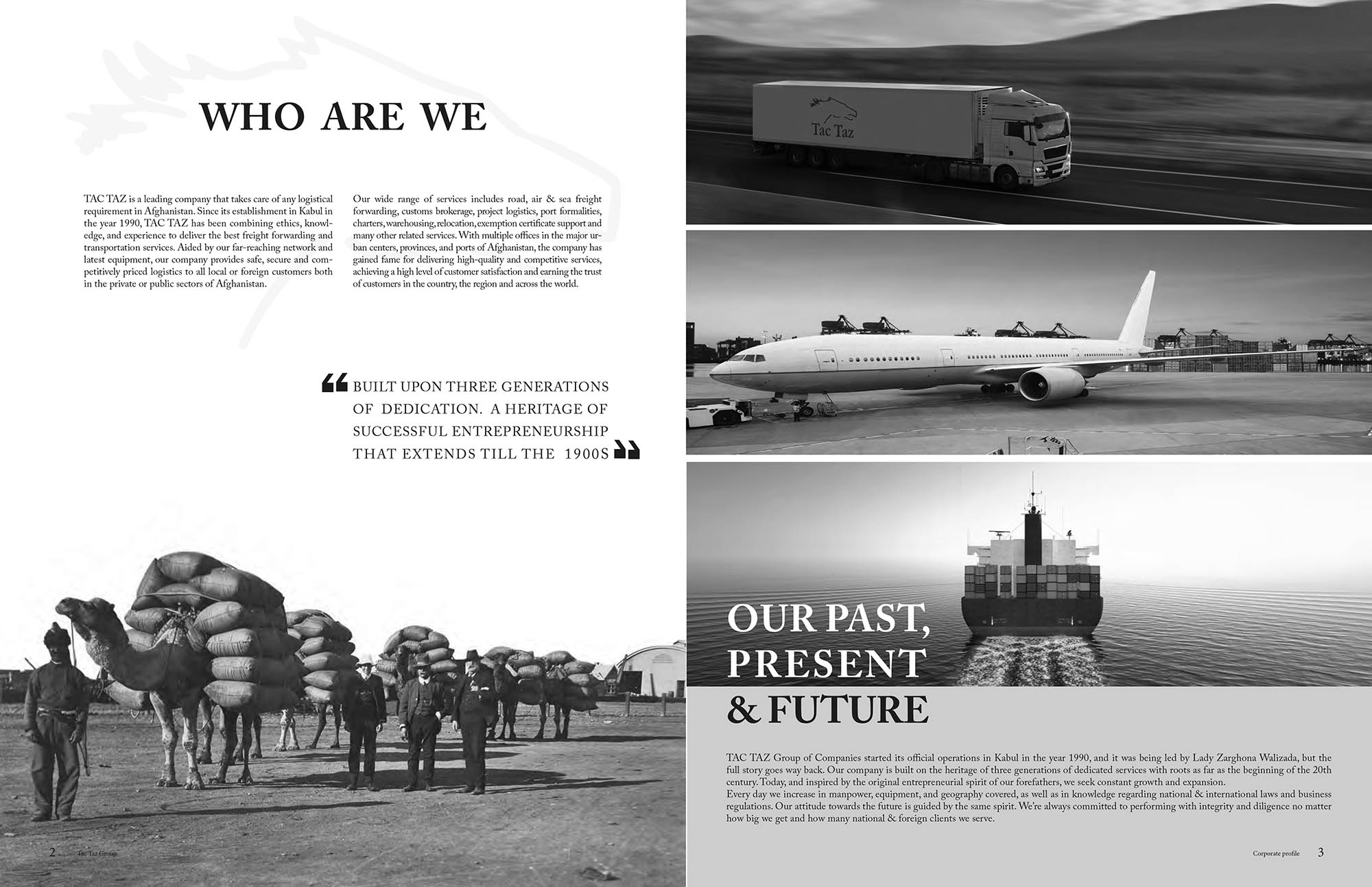 To complete their portfolio, TAC TAZ required a specialized Company Profile that professionally presents the company’s information and services. With the base of their operations being in Afghanistan, they approached UCT after finding them online and entrusted the task of developing the company profile to them. As TAC TAZ is involved in freight handling and logistics, the requested content from UCT had to equally captivate a professional feeling as well as a creative one, since this profile will be the face of the company when TAC TAZ puts forth a presentation to their prospects.