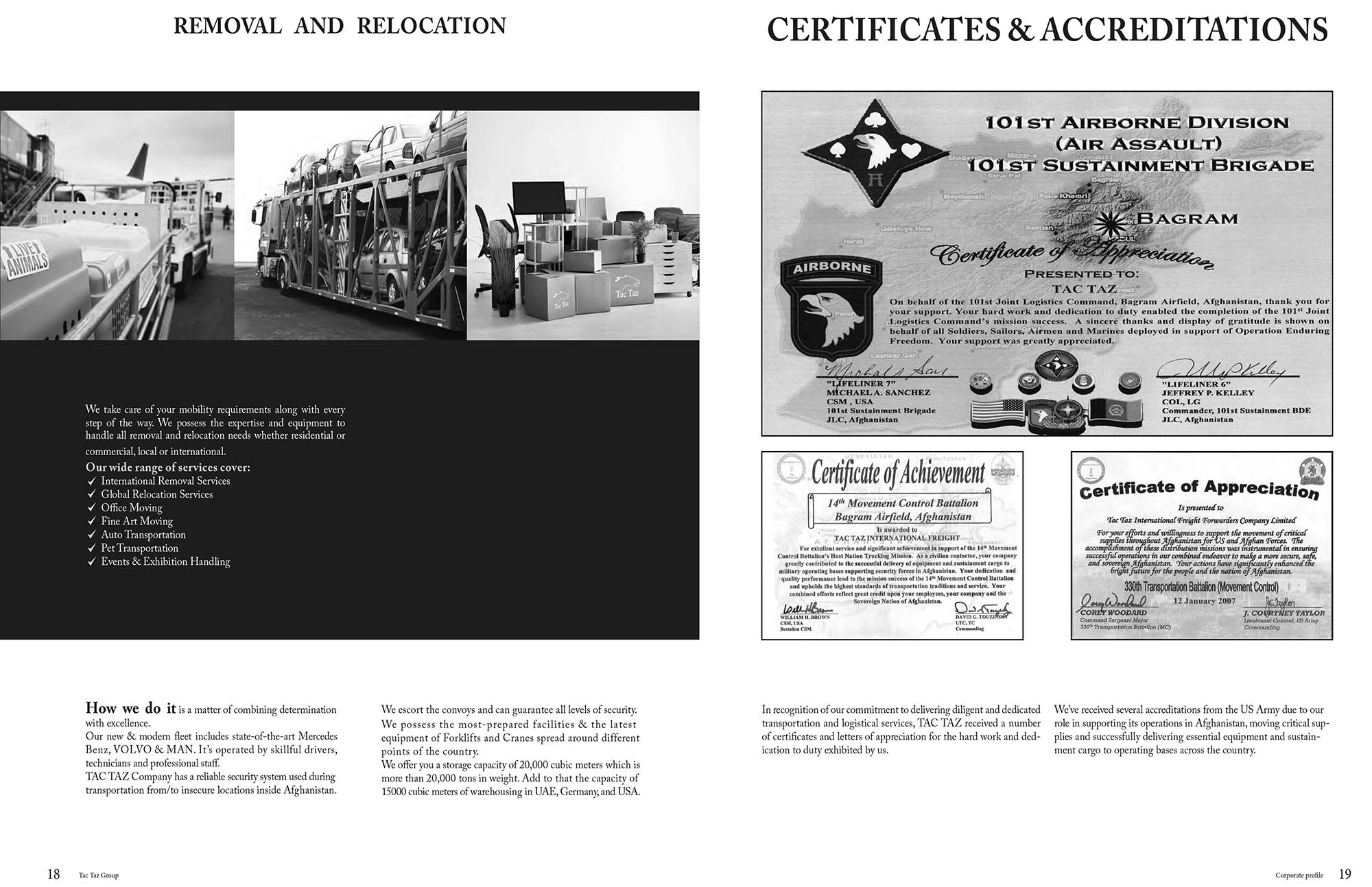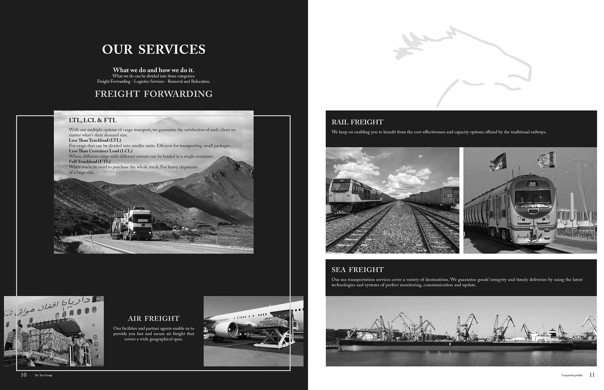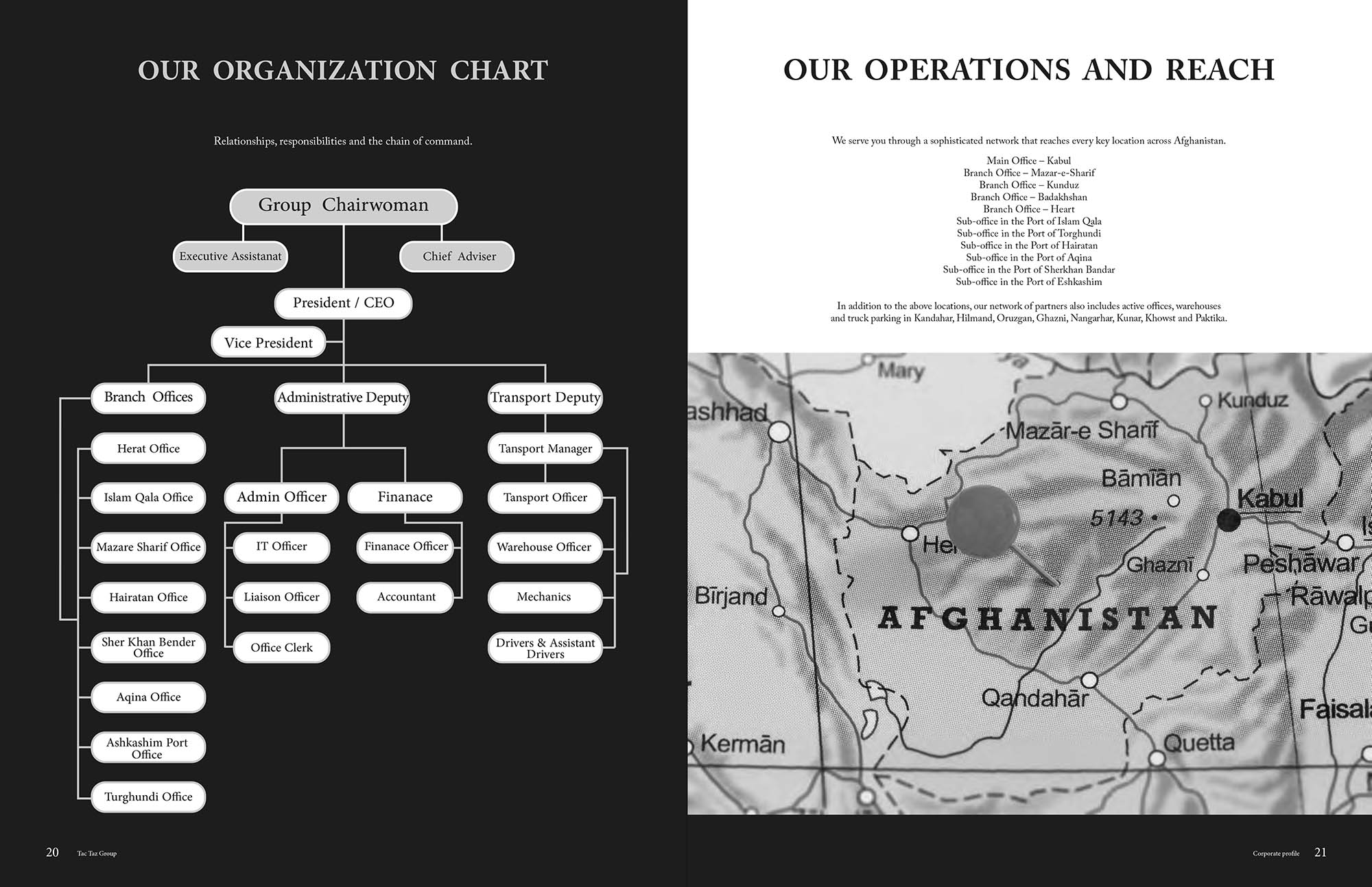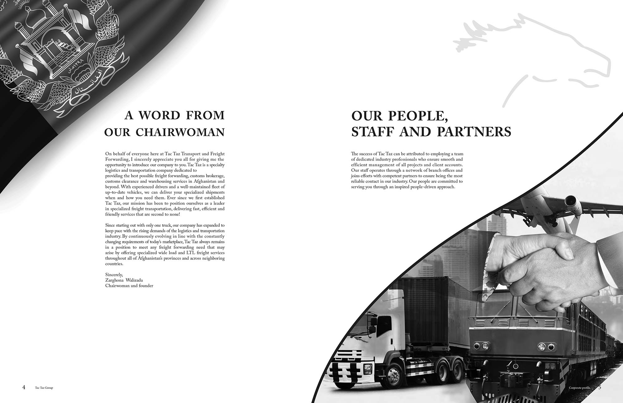 To complete their portfolio, TAC TAZ required a specialized Company Profile that professionally presents the company’s information and services. With the base of their operations being in Afghanistan, they approached UCT after finding them online and entrusted the task of developing the company profile to them. As TAC TAZ is involved in freight handling and logistics, the requested content from UCT had to equally captivate a professional feeling as well as a creative one, since this profile will be the face of the company when TAC TAZ puts forth a presentation to their prospects.
